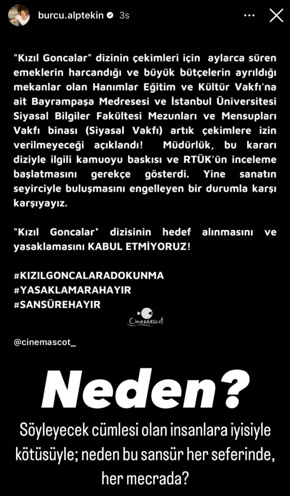 Diziye Yalı Çapkını dizisinin senaristi Burcu Alptekin'den de destek geldi. Alptekin sosyal medyadan konu ile ilgili paylaşım yaptı.