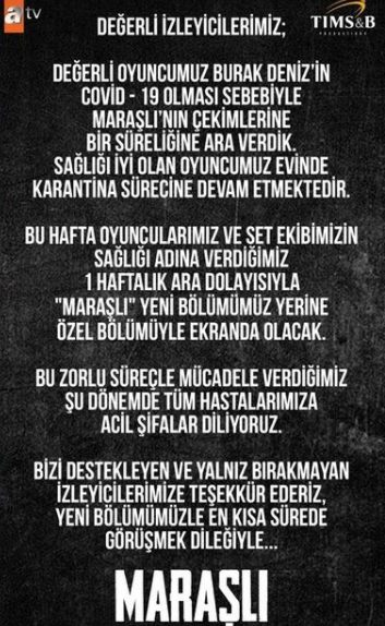 Şu sıralar atv dizisi Maraşlı'da izleyici karşısına çıkan Burak Deniz'den kötü haber gelmiş, oyuncunun koronavirüse yakalandığı öğrenilmişti.