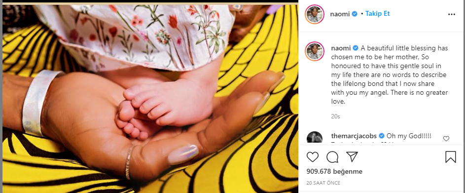 Campbell "Minik bebeğin kendisini, anne olarak seçtiğini" belirterek "Hayatımda bu nazik ruha sahip olduğum için gurur duyuyorum" diye yazdı. Ömür boyu sürecek böylesine bir bağı tarif edecek kelime bulamadığını belirten Naomi Campbell, kızından "meleğim" diye söz etti ve paylaşımını "Daha büyük bir aşk yok" diyerek bitirdi.
