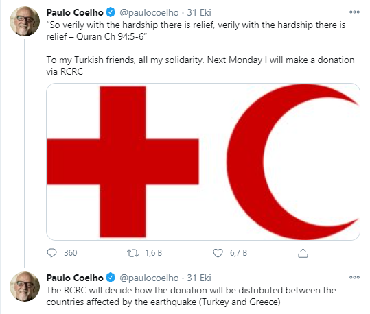 Coelho, Twitter hesabından Kuran’ın İnşirah Suresi’nde yer alan "Elbette zorluğun yanında bir kolaylık vardır. Gerçekten, zorlukla beraber bir kolaylık daha vardır" ayetine yer vererek, "Tüm dayanışmam Türk arkadaşlarıma, pazartesi günü Uluslararası Kızılhaç ve Kızılay Hareketi aracılığıyla bağış yapacağım. Bağışın depremden etkilenen ülkeler (Türkiye ve Yunanistan) arasında nasıl dağıtılacağına RCRC karar verecektir” ifadelerini kullandı.