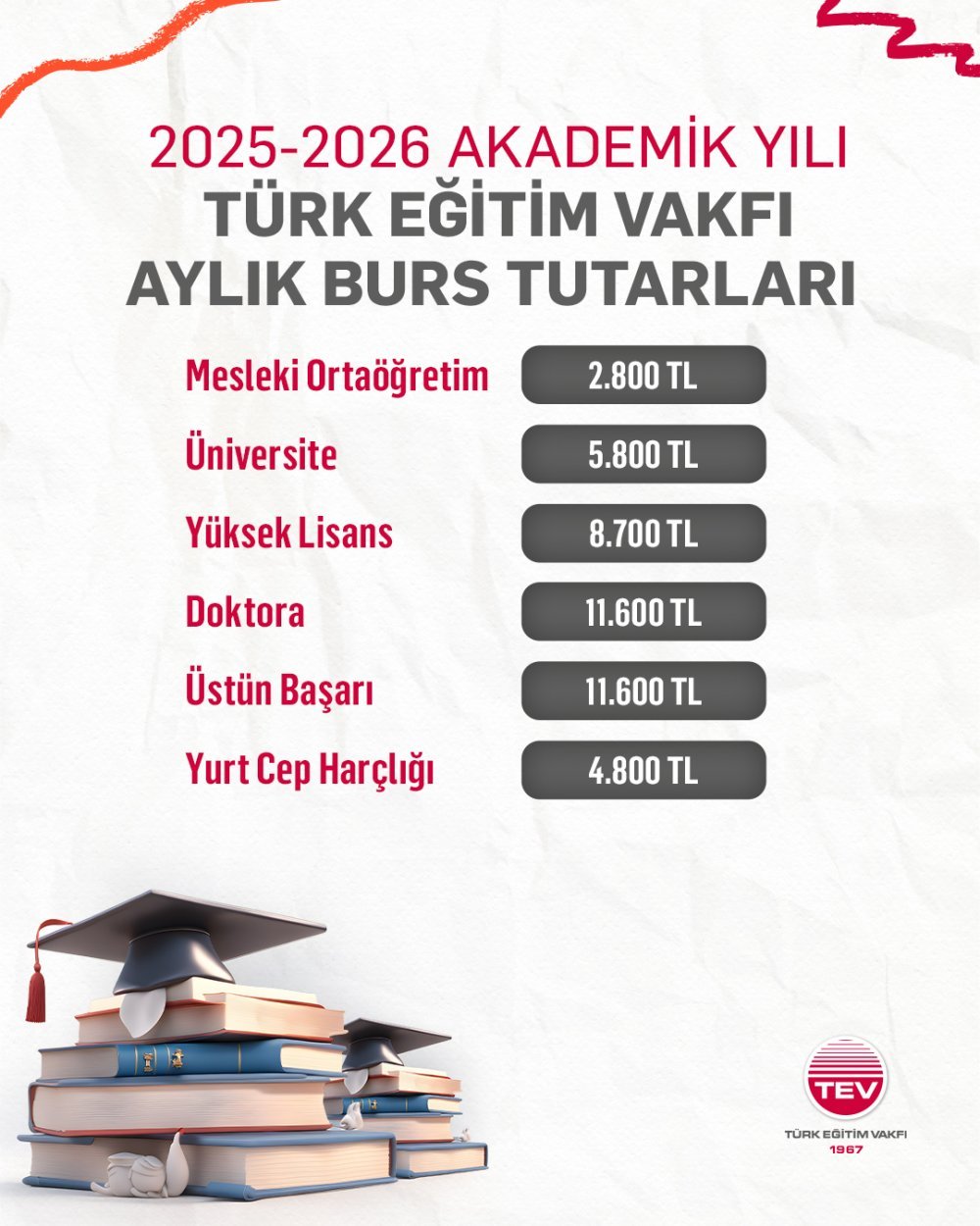 Eğitimde fırsat eşitliğini odağına alarak 58 yıllık köklü geçmişiyle çalışmalarını sürdüren Türk Eğitim Vakfı (TEV), başarılı ve imkanları sınırlı öğrencilerin öğrenim hayatlarına kesintisiz devam edebilmeleri için kapsamlı destek programları sunuyor. Her yıl on binlerce gencin eğitimine katkı sağlayan Vakıf, 2025–2026 akademik yılı itibarıyla burs tutarlarını artırarak öğrencilerin ihtiyaçlarına daha güçlü yanıt vermeyi hedefliyor.