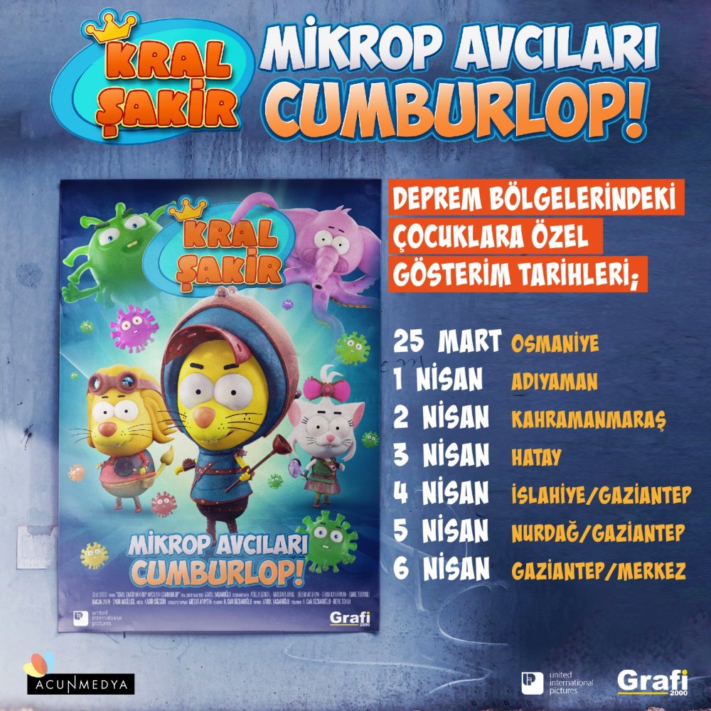 Acun Ilıcalı ve Varol Yaşaroğlu tarafından organize edilen etkinliklerde “Kral Şakir Mikrop Avcıları Cumburlop! “ filmi; Osmaniye, Hatay, Adıyaman, Kahramanmaraş, İslahiye, Nurdağ ve Gaziantep Merkez’de yapılan özel gösterimlerle depremzede çocuklara moral verecek. Kral Şakir ekibi film gösteriminin yanı sıra Kral Şakir maskotları ile de çocuklarla oyunlar oynayacak.