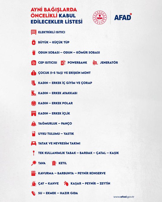 AFAD tarafından paylaşılan aşağıdaki ihtiyaç listesinde yer alan eşyaları, 81 ildeki valilikler ve ilçe kaymakamlıkları bünyesindeki Sosyal Yardımlaşma ve Dayanışma Vakıflarına ve tüm AFAD il müdürlüklerine başvurarak teslim edebilirsiniz.