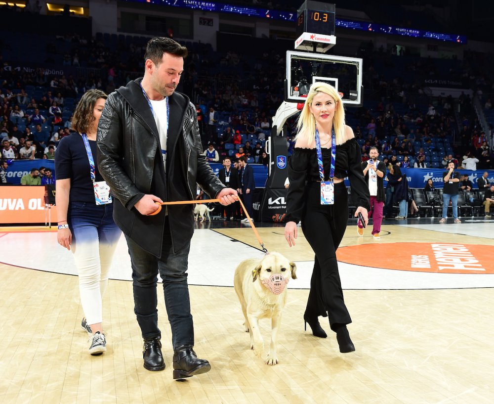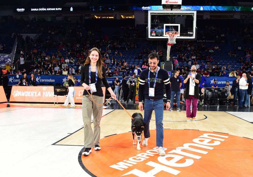 Afetzede köpeklerin ve barınak hayvanlarının sahiplendirilmesi için farkındalık yaratılması amacıyla Sinan Erdem Spor Salonu’na getirilen köpekler, devre arasında parkeye de çıktı. Tek tek anons edilen ve tanıtılan sevimli dostlarımız, eğitmenleriyle birlikte taraftarları selamladı.