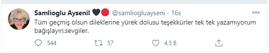Usta oyuncu sosyal medya hesabından yaptığı paylaşımla sevenlerine teşekkür etti ve "Tüm geçmiş olsun dileklerine yürek dolusu teşekkürler tek tek yazamıyorum bağışlayın, sevgiler" ifadelerini kullandı.