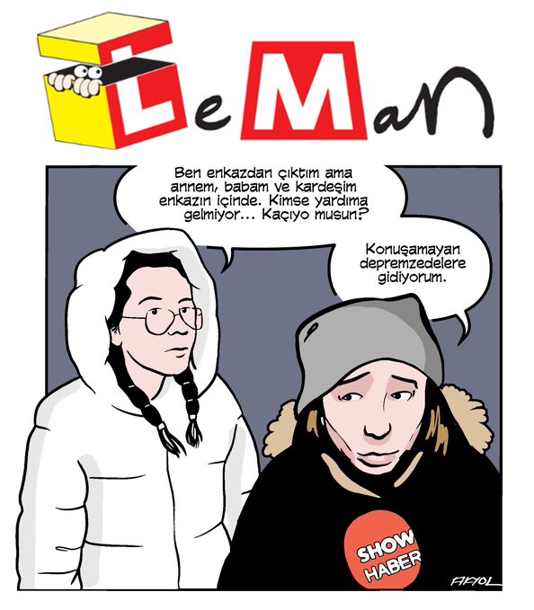 Haftalık mizah ve karikatür dergisi LeMan, enkaz altındaki ailesi için yardım isteyen depremzedeyi konuşturmayan ve sosyal medyada tepki toplayan Show TV muhabirini kapağına taşıdı.