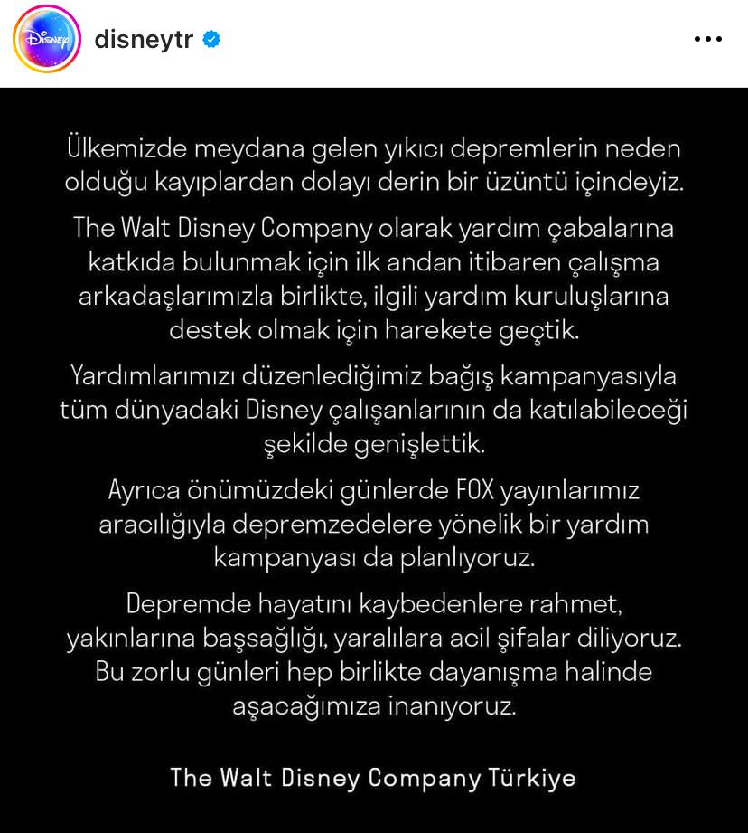 10 ilde yıkıma neden olan depremlerin ardından Disney Türkiye sosyal medya hesaplarından bir açıklama yayınladı.