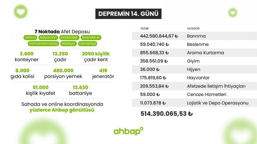 *Ahbap Muhasebe bana ulaşamamış 2 saattir. Az önce konuştuk. 446 milyon konteyner demişim. Halbuki açılımı şöyleymiş; 3600 adet Konteyner alımı : 278.831.000,00 TL. 13.250 adet Çadır alımı: 145.446.500,00 TL. 6.377 adet Yatak alımı: 2.884.346,00 TL. 25.428 adet Battaniye, Nevresim, Yastık, Yorgan vb alımı: 5.824.989,99 TL. 459 adet Jeneratör alımı: 8.821.773,85 TL. Çadır Elektrik Sistemi: 1.121.304,83 TL. Daha önce belirttiğim gibi 28 Şubat’ta http://Ahbap.org sitesinde yayınlanacak.