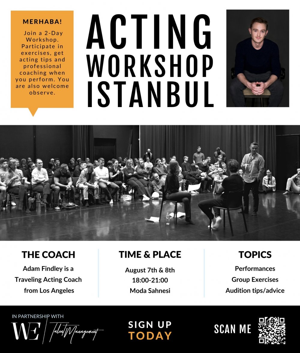 Adam Findley English Acting Studio İstanbul ; 7-8 Ağustos tarihlerinde Moda Sahnesi’nde yapılacak. Workshop için başvurular Findley Stüdyosunun internet sayfasından yapılıyor. Stüdyonun içeriğinde oyunculuk teknikleri, karakter analizi nasıl yapılır?, yaratıcı duygu durumu çalışması ve senaryo çalışması başlıkları dışında yurt dışındaki yapımlarda rol alabilmek için audition teknikleri hakkında öneriler de yer alıyor. Çalışma sırasında oyunculara yardımcı olabilmek adına tercüman da olacaktır.