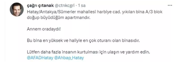 Hatay Antakya Sümerler Mahallesi Harbiye A-3 Blok adresinde yıkılan binada annesinin de yaşadığını söyleyen oyuncu yetkililere yardım çağrısı yaptığı tweet paylaştı.