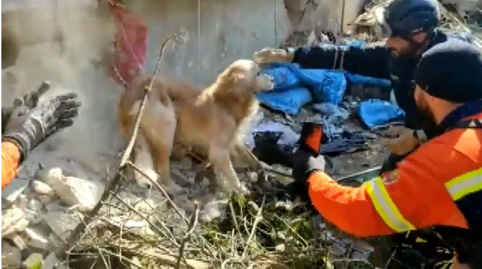 Maraş merkezli depremlerin ardından Portekiz’den yardıma gelen ekip, Antakya’daki arama kurtarma çalışmaları sırasında enkaz altından bir köpeği kurtardı.