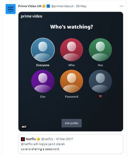 Prime Video, Twitter’dan yaptığı paylaşımla Netflix'in bu özelliğini eleştirdi. Prime Video platformu içerisindeki hesabı birden fazla kişinin kullanmasında sakınca görmediği Who’s Watching menüsünü Netflix'in tweet'ini alıntılayarak paylaştı paylaştı.
