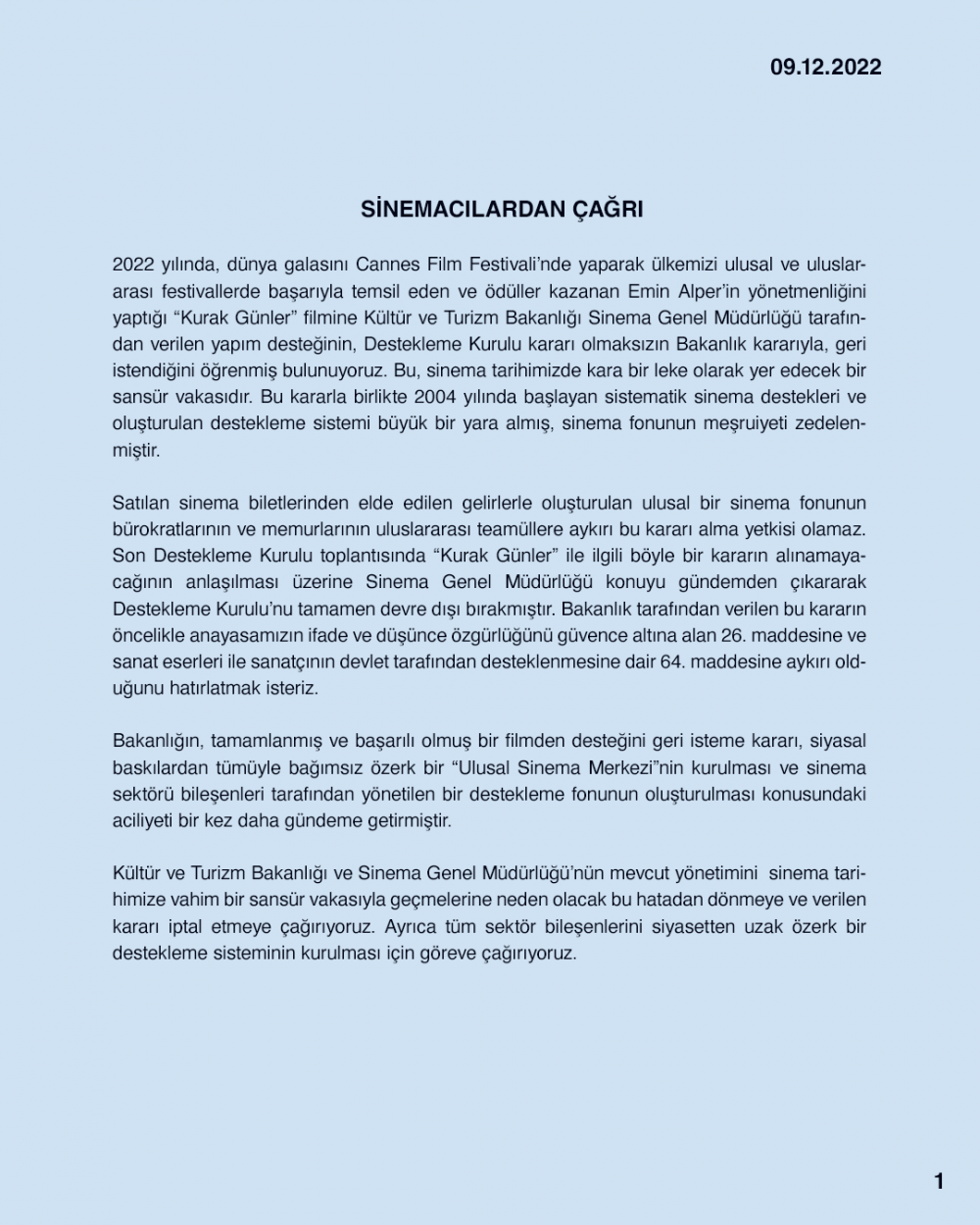 Kültür ve Turizm Bakanlığı ve Sinema Genel Müdürlüğü’nün mevcut yönetimini sinema tarihimize vahim bir sansür vakasıyla geçmelerine neden olacak bu hatadan dönmeye ve verilen kararı iptal etmeye çağırıyoruz. Ayrıca tüm sektör bileşenlerini siyasetten uzak özerk bir destekleme sisteminin kurulması için göreve çağırıyoruz.”