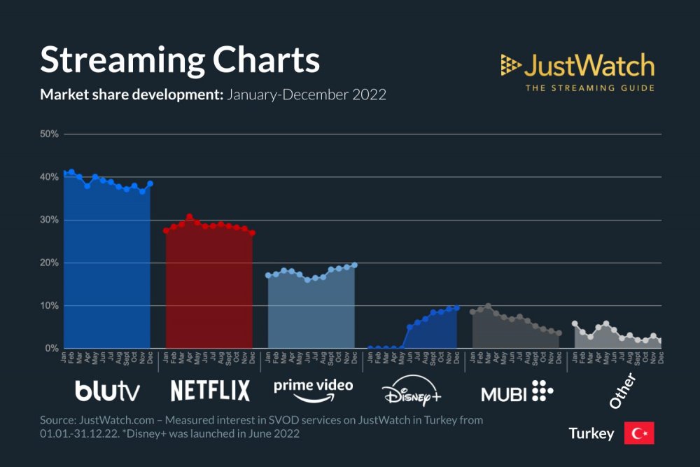 Yeni gelen Disney+, Türkiye pazarında yükselen bir yıldız ve Haziran ayında lansmanından bu yana yılı pazarın %10'unu kazanarak kapatıyor. Prime Video, Ocak ayından bu yana %3 artışla 2022'de pazar payı kazanan diğer tek büyük oyuncu oldu. Bu kazanımların blutv, Netflix ve Mubi üzerinde net bir etkisi oldu; her biri sırasıyla -%2, -%1 ve -%5 kaybetti.
