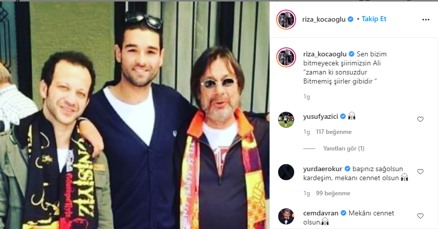 Yaşamını yitiren Ali'nin haberini alan Rıza Kocaoğlu kahroldu. Ünlü oyuncu arkadaşıyla çekilmiş bir fotoğrafını "Sen bizim bitmeyecek şiirimizsin Ali / zaman ki sonsuzdur /Bitmemiş şiirler gibidir" notuyla paylaştı.