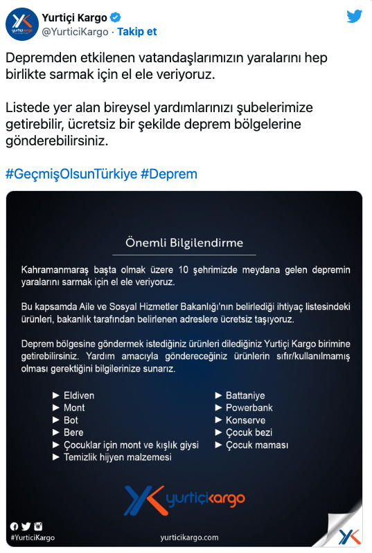 Aile ve Sosyal Hizmetler Bakanlığı, AFAD ve Kızılay ile koordineli bir şekilde çalışmalarını sürdüren Yurtiçi Kargo, şubelerinden deprem yardımlarını kabul etmeye başladı. Şirketten yapılan açıklamaya göre, deprem bölgesine yardım kolisi göndermek isteyen vatandaşlar kolilenmiş yardımlarını istedikleri herhangi bir Yurtiçi Kargo şubesine getirebilecek.