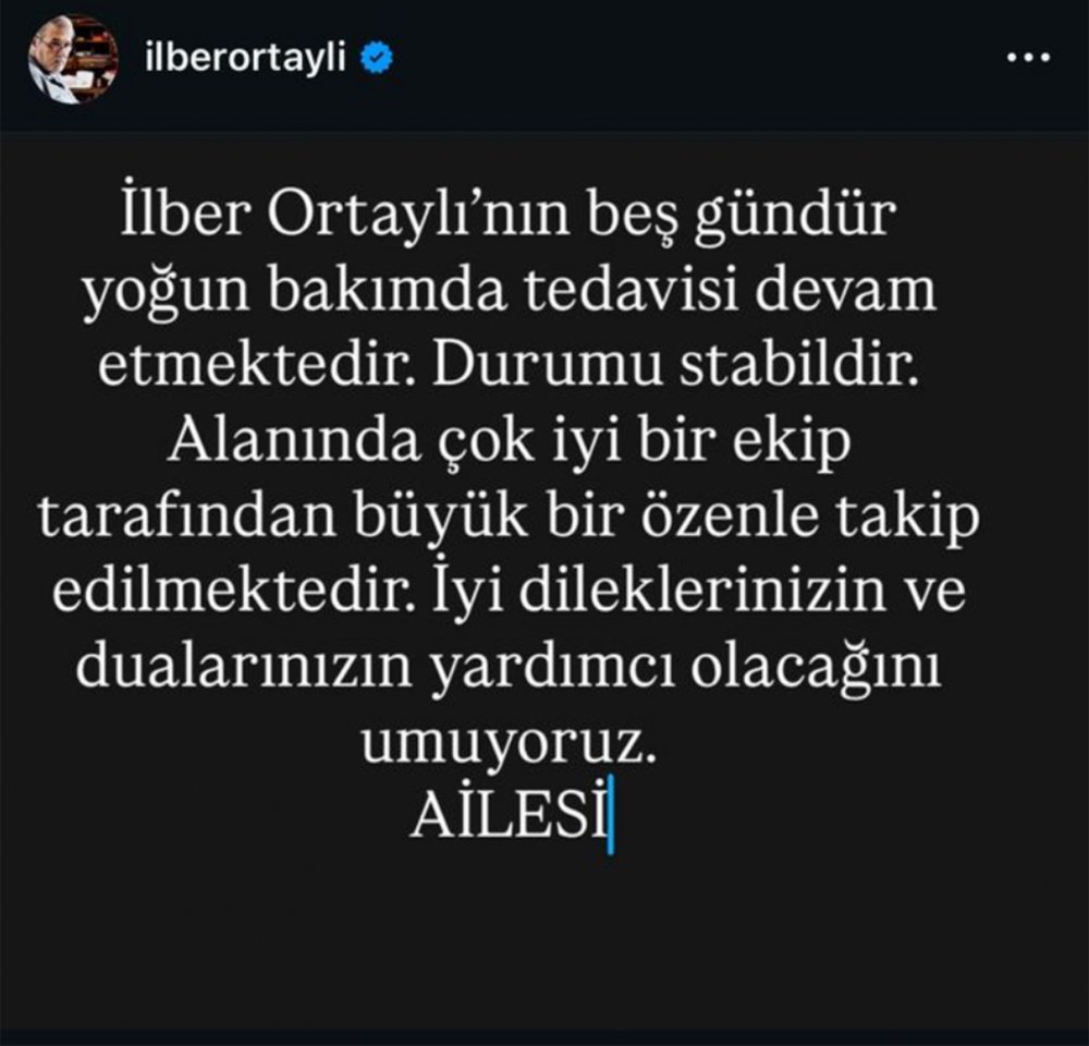 Ailesi, İlber Ortaylı'nın sosyal medya hesabından yaptığı açıklamada, şu ifadelere yer verdi: İlber Ortaylı’nın 5 gündür yoğun bakımda tedavisi devam etmektedir. Durumu stabildir. Alanında çok iyi bir ekip tarafından büyük bir özenle takip edilmektedir. İyi dileklerinizin ve dualarınızın yardımcı olacağını umuyoruz.