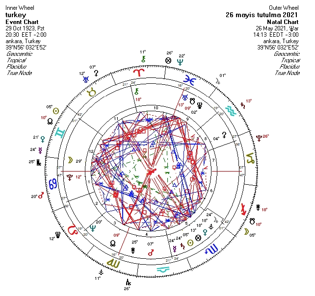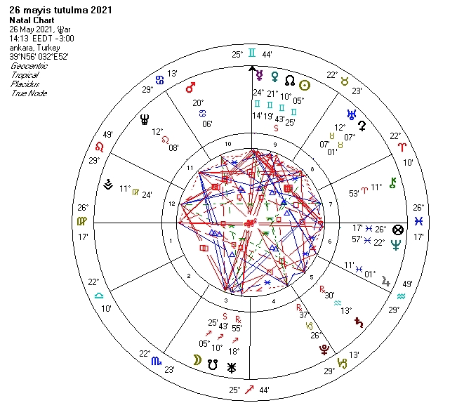 Haritada Başak burcu yükselmekte; iş alanları, işçiler, iş verenler, çalışan kesim, sendikalar, hizmet sektörü, sağlıkla ilgili alanlar önem kazanıyor. Yine muhasebe ve bankacılık alanlarında yapılması gerekenler öne çıkabilir. Yöneticisi Merkür ikizler burcunda ve tepe noktasına çok yakın. 9. Evde İkizler burcunda birden fazla gezegen olduğunu görüyoruz. Hareketli ve aktif bir burç olan İkizler burcuyla ticari konuların, eğitimle ilgili alanların, seyahatlerin, hukukun önemli olacağını anlıyoruz. Uluslararası davaların sonuçları bu dönem ve bu tutulmanın tetiklendiği tarihlerde karşımıza gelebilir.