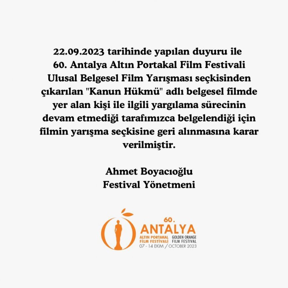 Antalya Altın Portakal Film Festivali'nde belgesel kategorisine yer alan "Kanun Hükmü" filmi, belgeseldeki bir kişi hakkında yargı sürecinin devam ettiği iddiasıyla festivalden çıkarılmıştı.
