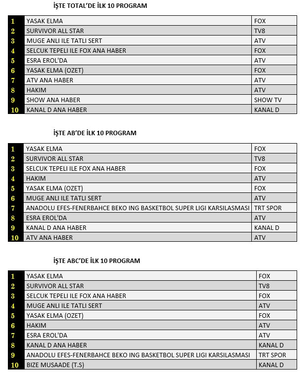 AB'de ise 1. sırada “Yasak Elma”, 2. sırada “Survivor All Star” 3. sırada “Selçuk Tepeli İle Fox Ana Haber” yer aldı.
