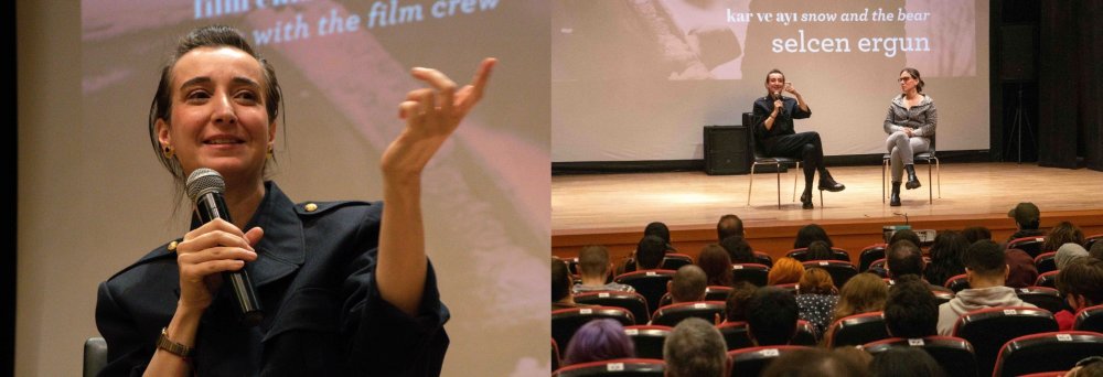 Mecburi hizmet için atandığı bir köyde sırların ve erk ilişkilerinin arasında kalan hemşire Aslı’nın hikâyesini anlatan, doğanın da bir karakter olarak yer aldığı Kar ve Ayı gösterimi sonrası Selcen Ergun izleyicilerle buluştu. Ergun, “Aslında bir hikâye yazarken onun ne kadar büyük ya da küçük olduğu ve zorlukları ile yola çıkmıyorsun, en azından ben öyle yazmıyorum. Gerçekten o dönem bir derdim, hissettiğim bir sıkışmışlık, güvende olmama duygusu vardı. O duygudan çıkan bir hikâye. O duygunun daha da elle tutulur olması ve yoğunlaşması için aslında tercih ettiğim şey, dış dünyayla giderek kopuk, kendi içine kapanan ve kendi içine kapandığı dünyada kendine düşmanlar yaratan bir dünya yaratmaktı. Masalsı bir tarafı olmasıydı. Sesin de katkısı vardır. Bu kasabada doğanın, hayvanların varlığını hissettirecek, insanların dört tarafını sardığını ve belki de onlardan daha da baskın olduğunu hissettirecek bir ses dünyası tasarlamaya çabaladık. Hangi hayvan sesinin hangi duyguda geleceği ve nerede var olacağı belliydi, müziği arka planda tutup o dünyayı ve filmin ritmini ses kuşağı ile çalıştık. Ana karakterlerimiz dışında doğanın ve onun varlıklarının da bir karakter olması ve dönüşmesi var filmin içinde,” dedi.