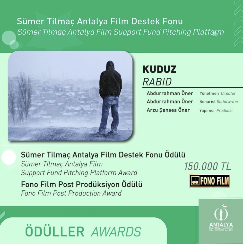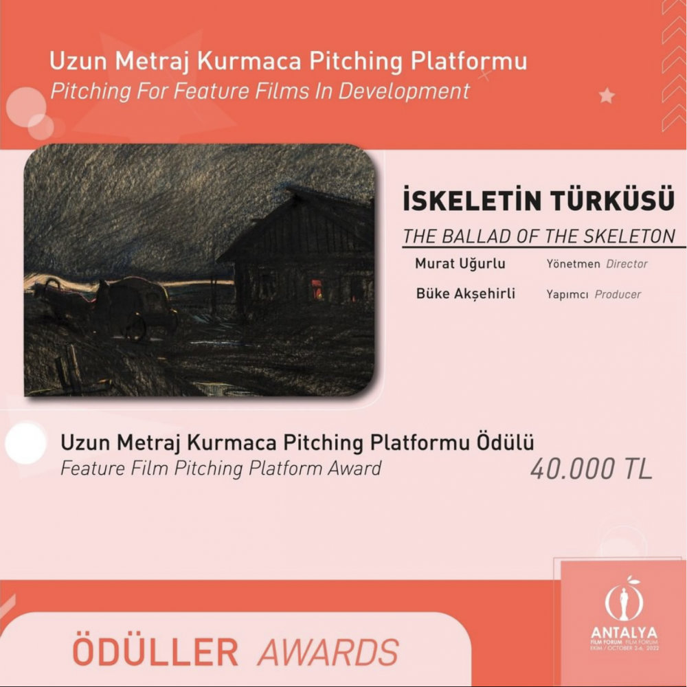 “İskeletin Türküsü” ve ‘Güve’ye 40’ar bin TL Ödül! Dokuz projenin yarıştığı Uzun Metraj Kurmaca Pitching Platformu’nda, Antonio Saura, Selin Vatansever Tezcan ve Teresa Hoefert de Turégano’dan oluşan jüri, iki projeye toplam 80 bin TL tutarındaki Uzun Metraj Kurmaca Pitching Platformu Ödülü’nü verdi. Murat Uğurlu’nun yönettiği, Büke Akşehirli’nin yapımcısı olduğu “İskeletin Türküsü” ve yönetmenliği Aslı Akdağ’a, yapımcılığı Bilal Bağcı’ya ait “Güve” adlı projelerin her biri 40 bin TL para ödülü kazanırken; Ziya Demirel’in yönettiği, Anna Maria Aslanoğlu’nun yapımcılığındaki “Kara Şimşek 3: Mavi Okyanus” adlı proje, Film Standartları Post-Prodüksiyon Ödülü’nü kazandı. Tunç Şahin’in yönetmenliğini üstlendiği, yapımcılığını Aslı Filiz ve Ersan Çongar’ın paylaştığı “8. Kat” projesi Filmarka Ekipman Desteği Ödülü’ne layık görüldü.