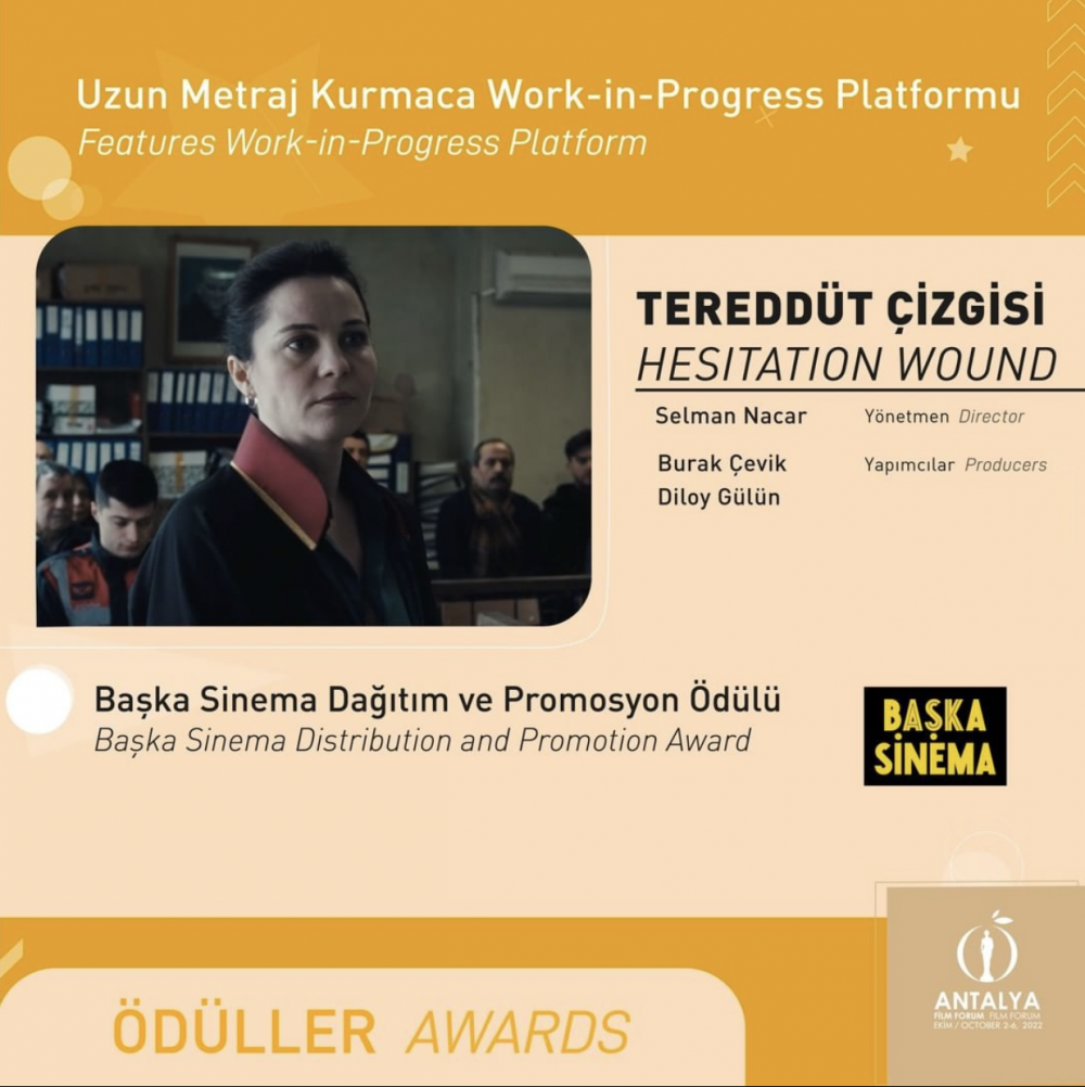 Kurmaca Work-in-Progress Kazananları “Yurt” ve “Yeni Şafak Solarken”! Çekimleri tamamlanmak üzere olan ya da post-prodüksiyon aşamasındaki projelerin desteklendiği Uzun Metraj Kurmaca Work-in-Progress Platformu’nda ise beş proje yarıştı. Anna Hoffmann, Dilek Aydın ve Nathalie Jeung’dan oluşan jüri; Nehir Tuna’nın yönettiği Tanay Abbasoğlu ve Dorothe Beinemeier’ın yapımcısı olduğu “Yurt” projesine, 80 bin TL değerindeki Uzun Metraj Kurmaca Work-in-Progress Ödülü’nü ve Gürcan Keltek’in yönettiği, Arda Çiltepe’nin yapımcılığını üstlendiği “Yeni Şafak Solarken” projesine, 40 bin TL değerindeki Uzun Metraj Kurmaca Work-in-Progress Jüri Özel Ödülü’nü verdi. Başka Sinema Dağıtım ve Promosyon Ödülü yönetmenliğini Selman Nacar’ın, yapımcılığını Burak Çevik ve Diloy Gülün’ün yaptığı “Tereddüt Çizgisi” adlı projeye verildi.
