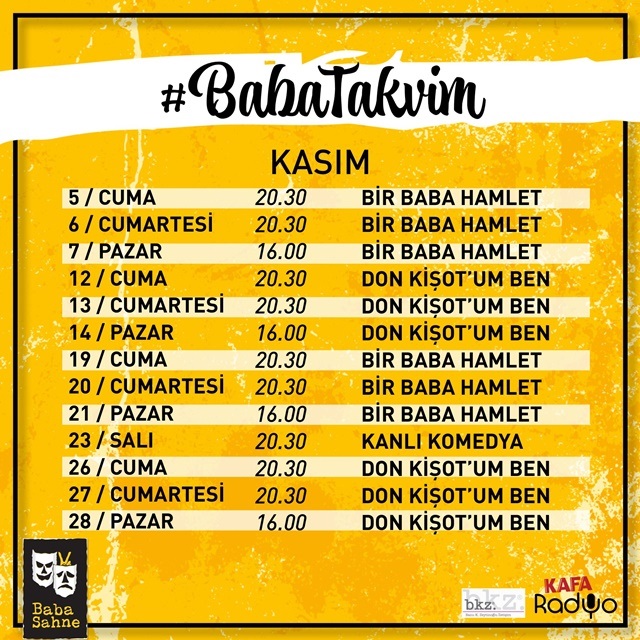 Tiyatroseverlerle kendi salonunda buluşmanın mutluluğunu yaşayan Baba Sahne, kasım ayı programında çok sevilen oyunları “Bir Baba Hamlet”, “Don Kişot’um Ben” ve Kanlı Komedya ‘Caligula’yı sahnelemeye devam ediyor. Şevket Çoruh ve Günay Karacaoğlu’nun rol aldığı “Bir Baba Hamlet” 5, 6, 7, 19, 20 ve 21 Kasım’da; Ozan Güven ile Günay Karacaoğlu’nun başrollerini paylaştığı “Don Kişot’um Ben” 12, 13, 14, 26, 27 ve 28 Kasım’da; zalim Roma İmparatoru Caligula’nın trajikomik hikâyesi Kanlı Komedya ‘Caligula’ ise 23 Kasım’da Baba Sahne’de!