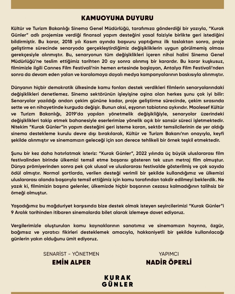 Emin Alper konuyla ilgili, "'Kurak Günler' sayesinde ilk kez uzun metraj bir film için 'parayı geri isteme' örtük tehdidi hayata geçirildi. Dolaylı bir sansür mekanizması işletilerek paramız geri isteniyor şu an. Bu çok tehlikeli. Bütün yönetmenleri şu an tedirgin eden bir sürece imza atmış oldu maalesef bakanlık" dedi.
