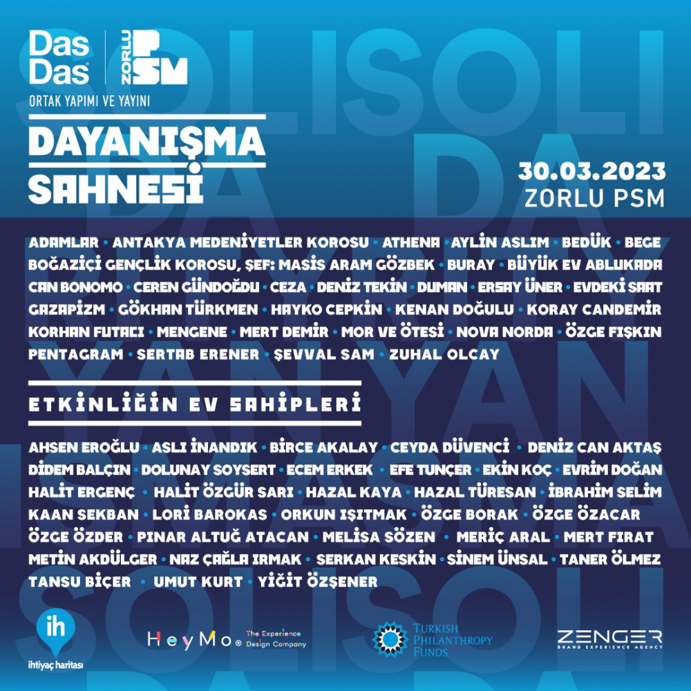 DasDas ve Zorlu PSM ortaklığıyla oluşturulan İhtiyaç Haritası aracılığıyla birbirinden değerli, alanında başarılı birçok müzisyen ve oyuncunun katkısı ile yardımların ihtiyaç sahiplerine direkt olarak ulaşabilmesine olanak sağlayacak. Aslı İnandık, Ahsen Eroğlu, Birce Akalay, Ceyda Düvenci, Deniz Can Aktaş, Didem Balçın, Dolunay Soysert, Ecem Erkek, Efe Tunçer, Ekin Koç, Evrim Doğan, Halit Ergenç, Halit Özgür Sarı, Hazal Kaya, Hazal Türesan, İbrahim Selim, Kaan Sekban, Lori Barokas, Melisa Sözen, Meriç Aral, Mert Fırat, Metin Akdülger, Naz Çağla Irmak, Orkun Işıtmak, Özge Borak, Özge Özacar, Özge Özder, Pınar Altuğ Atacan, Serkan Keskin, Sinem Ünsal, Taner Ölmez, Tansu Biçer, Umut Kurt ve Yiğit Özşener gibi değerli sanatçılar ‘Dayanışma Sahnesi’nde birlik ve beraberlik ruhu ile bir araya gelecek.