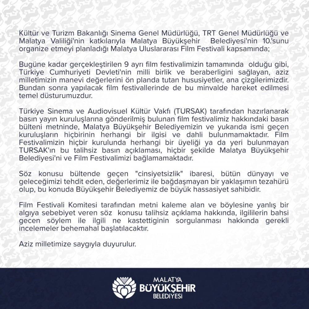 1-5 Aralık günleri arasında gerçekleşmesi planlanan festivali düzenleyen Malatya Büyükşehir Belediyesi, sosyal medya üzerinden yürütülen tartışma ve tepkiler üzerine, “cinsiyetsiz ödül” eksenli bültenin kendilerine ait olmadığını savundu. Açıklamada, "Söz konusu bültende geçen cinsiyetsizlik ibaresi, büyün dünyayı ve geleceğimizi tehdit eden, değerlerimizle bağdaşmayan bir yaklaşımın tezahürü olup bu konuda büyükşehir belediyemiz de büyük hassasiyet sahibidir. Film Festivali Komitesi tarafından metni kaleme alan ve böylesine yanlış bir algıya sebebiyet veren söz konusu talihsiz açıklama hakkında, ilgililerin bahsi geçen söylemle ilgili ne kastettiğinin sorgulanması hakkında gerekli işlemler başlatılacaktır" denildi.