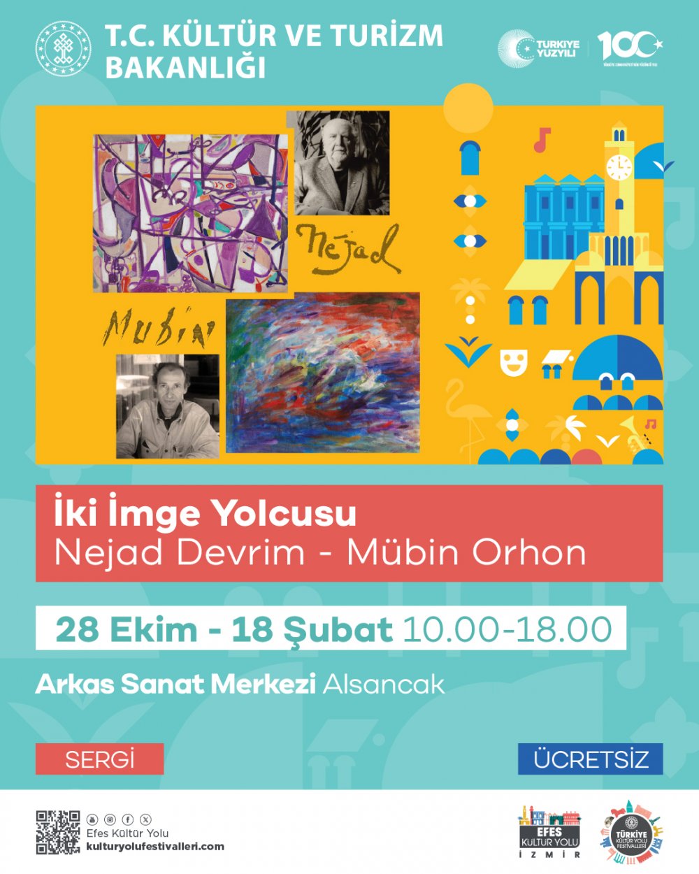 İzmir’deki Arkas Sanat, Folkart Galeri gibi kültür kurumları da festival kapsamına girerek, bir anlamda festival boyunca tek çatı altında toplandı. Cumhuriyet devrimleriyle eğitim almış, sanat çalışmalarını bu devrimlerin ışığıyla şekillendirilmiş ilk kuşak olarak tarihsel bir öneme sahip olan iki değerli sanatçının; Nejad Devrim ve Mübin Orhon’un, eserlerinden oluşan “İki İmge Yolcusu/Nejad Devrim, Mübin Orhon Sergisi” festival boyunca ve sonrasında 18 Şubat’a kadar Arkas Sanat Merkezi’nde ziyaret edilebilecek. Küratörlüğünü Necmi Sönmez’in üstlendiği sergi, bu iki sanatçının olgunluk dönemi eserlerini ilk kez eş zamanlı bir süreçte inceliyor.