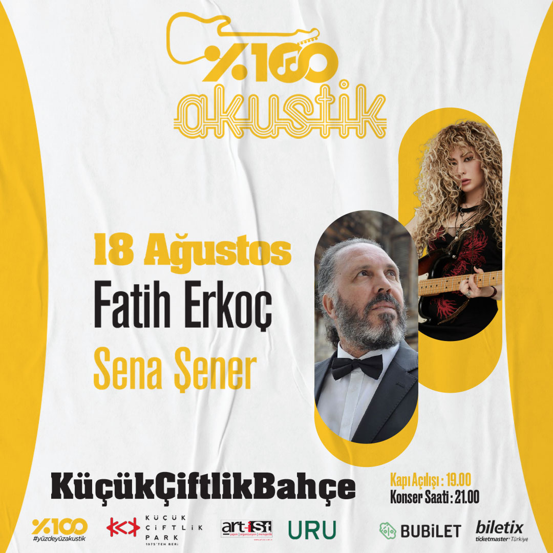 Yarın akşam KüçükÇiftlik Bahçe’de gerçekleşecek %100 Akustik konserinde Türkiye’nin en güçlü seslerinden ve en önemli müzisyenlerinden Fatih Erkoç sahne alacak. Öncesinde ise melankolik sesiyle genç yaşına rağmen büyük bir başarı yakalayan Sena Şener, şarkılarının akustik yorumuyla sahnede olacak. Biletler Biletix’te, Bubilet’te ve KüçükÇiftlik Park gişesinde!