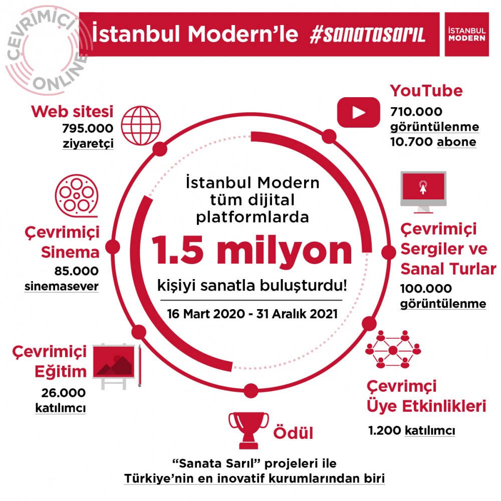 Pandemi süresince müzenin dijital platformlarında da sergi ve etkinliklerini sürdüren İstanbul Modern,17 Mart-10 Aralık 2021 tarihleri arasında 1,5 milyon kişiyi sanatla buluşturdu.