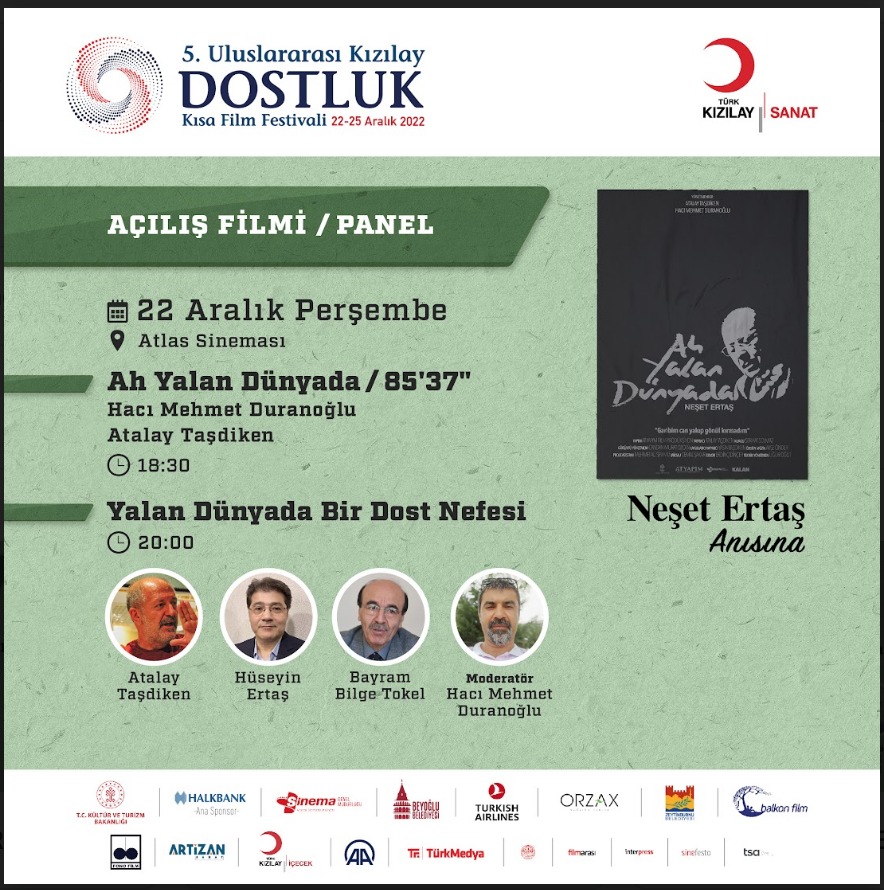 Festival açılışı ise Atalay Taşdiken ve Hacı Mehmet Duranoğlu’nun Neşet Ertaş anısına yaptığı “Ah Yalan Dünyada” isimli belgesel gösterimi ile yapılacak. Gösterimin ardından düzenlenecek panelde Neşet Ertaş’ın oğlu Hüseyin Ertaş, yakın arkadaşı Bayram Bilge Tokel ve Atalay Taşdiken, Festival Başkanı Faysal Soysal’ın moderatörlüğünde konuşmacı olacak. 22 Aralık Perşembe günü saat 18.00’da Atlas 1948 Sineması’nda başlayacak etkinliğe dileyen herkes katılabilecek.
