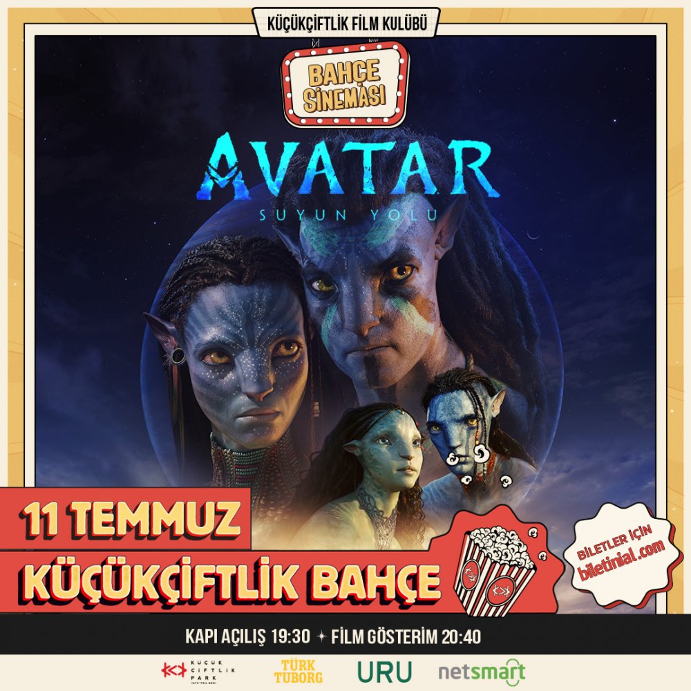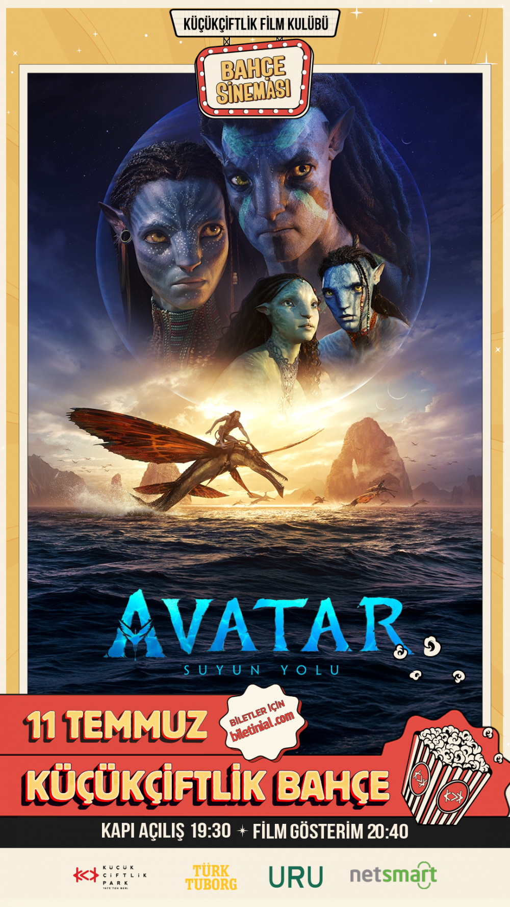 KüçükÇiftlik Film Kulübü Sunar: Bahçe Sineması’nın çok konuşulan ve ödüllü yapımları bir araya getiren 2023 seçkisi, 11 Temmuz Salı akşamı saat 20.40’ta sinema tarihinde iki milyar dolardan fazla gişe hasılatı elde eden altı film arasına giren “Avatar: Suyun Yolu” ile başlayacak. Tarihin en yüksek gişe hasılatı rekorunu hâlâ elinde bulunduran “Avatar”ın yıllarca heyecanla beklenen devam filmi “Avatar: Suyun Yolu”, Pandora gezegeninde Na'vi halkına dahil olup Neytiri ile bir aile kuran Jake Sully'nin, tanıdık bir düşmanın yeniden gezegenlerine tehdit oluşturması sonrası Na'vi halkıyla birlikte verdiği mücadeleyi konu ediniyor. James Cameron’ın senaryosunu Josh Friedman ve Shane Salerno ile birlikte kaleme aldığı ve aynı zamanda yönetmen koltuğunda oturduğu filmin oyuncu kadrosunda ise Sam Worthington, Zoe Saldana, Kate Winslet, Sigourney Weaver gibi dünyaca ünlü birçok isim yer alıyor.