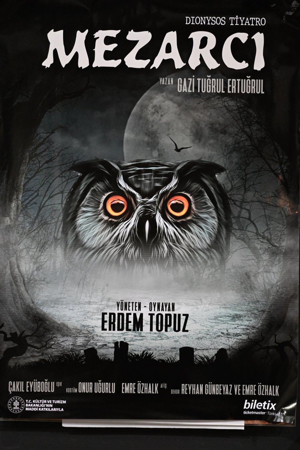 Erdem Topuz'un başrolünde oynadığı ve yönettiği ayrıca 25 yıl önce Gazi Tuğrul Ertuğrul tarafından kaleme alınan ''Mezarcı'' Dionysos Tiyatro yapımıyla tek perdelik bir oyun olarak sanatseverlerle buluşuyor.
