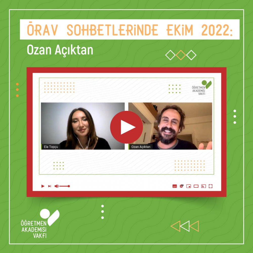 Öğretmen Akademisi Vakfı, her ay gerçekleştirdiği ÖRAV Sohbetleriyle; bilgi ve deneyimleri, sıra dışı meslekleri ve hayatlarıyla, ilham veren konukları öğretmenlerle bir araya getirmeye devam ediyor. ÖRAV’ın Youtube kanalından herkesin erişimine açık olarak yayınlanan sohbet serisinin bu ayki konuğu; Silsile, Aile Arasında, Atiye, Geçen Yaz gibi birçok filmin yönetmeni olan, yazar ve senarist Ozan Açıktan oldu. Sohbette Ozan Açıktan sinema yolculuğuna ve bir filmin üretim aşamalarına dair merak edilenleri anlattı.