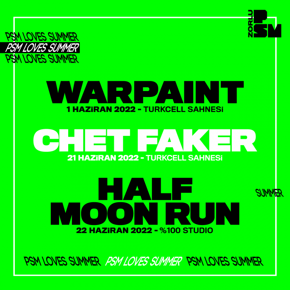 Zorlu PSM, 2022 yazına damga vuracak PSM Loves Summer konser serisine yeni isimler eklemeye devam ediyor. Arctic Monkeys, Placebo, Alt-J ve DIIV gibi isimlerin açıklandığı Zorlu PSM'nin ilk yaz konser serisi PSM Loves Summer’da Warpaint, Chef Faker ve Half Moon Run da sahne alacak. Biletler 22 Aralık’ta passo.com.tr’de satışta olacak.