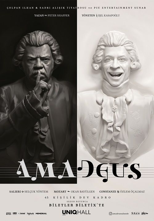 18-19 Kasım’da, Zorlu PSM Turkcell Sahnesi’nde, saat 19.30’da perde açacak olan “Amadeus” kapalı gişe olarak sahnelenmeye devam ediyor. Sahne önünde 35, sahne arkasında da 20 kişiden oluşan toplam 55 kişilik dev kadrosuyla, Peter Shaffer tarafından kaleme alınan ve usta yönetmen Işıl Kasapoğlu’nun yönettiği oyunun kostümleri Nalan Alaylı tarafından hazırlanırken, “Amadeus”un, dönem makyajları ise Neriman Eröz’e ait.