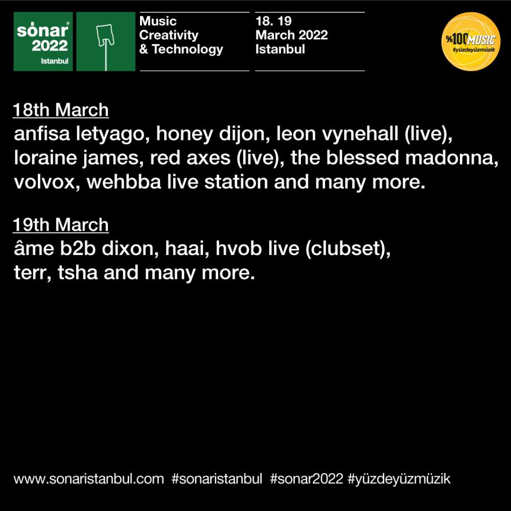 Avrupa’nın en prestijli müzik festivallerinden biri olarak kabul edilen ve her sene büyük merakla beklenen Sónar’ın %100 Music katkılarıyla altıncısı düzenlenecek İstanbul ayağında yer alacak ilk isimler açıklandı. Şimdiye kadar binlerce müzikseveri, Zorlu PSM’nin tüm alanlarını büyüleyici bir hale dönüştürerek ağırlayan, öte yandan Sónar +D etkinlikleriyle insanları müzik, yaratıcılık ve teknoloji ekseninde bir araya getiren ve katılımcılarına unutulmaz bir festival deneyimi yaşatan Sónar İstanbul 2022’nin line-up’ında bu sene de elektronik müzik sahnelerinin değerli DJ ve prodüktörleri yer alıyor.