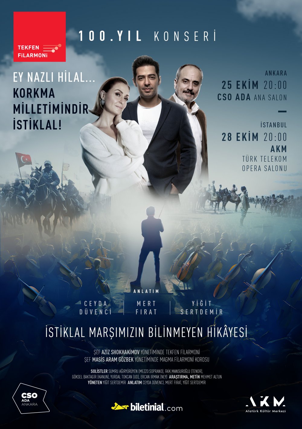 Tekfen Filarmoni olarak Cumhuriyet’in 100. yılında, milli marş olmaya aday 12 eserin ve dönemin hikayesini, tarihe not düşecek bir konserle anlatmaya hazırlandıklarını ifade eden Kalafat, şunları söyledi: “Henüz Milli Mücadele devam ederken bir milli marşa ihtiyaç duyan Mustafa Kemal ve dava arkadaşlarının başlattığı güfte ve beste yarışmalarının ilginç hikayesini, tiyatro yönetmeni ve oyuncusu Yiğit Sertdemir’in rejisiyle, milyonların sevdiği, Cumhuriyet değerlerimizi yürekten temsil eden sanatçılarımız Ceyda Düvenci, Mert Fırat ve Yiğit Sertdemir canlandıracaklar.