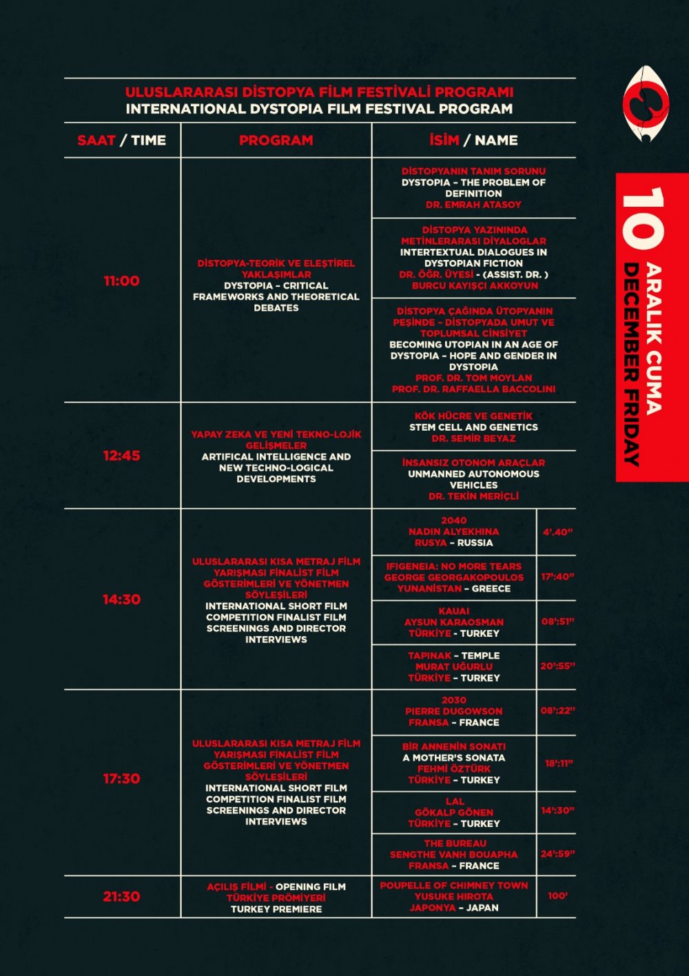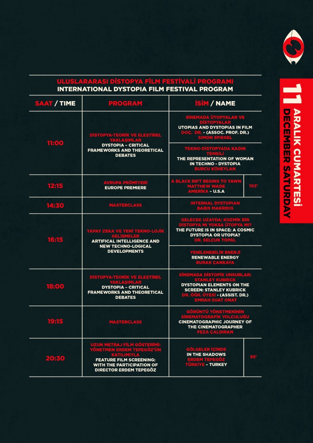 12 Aralık Pazar günü Future Talks programında Emre Oskay ve Serdar Can ile birlikte Distopik Filmlerin Yapım ve Dağıtım Süreci hakkında bilinmeyenler konuşulacak. Distopik filmlerin geleceğine dair bilgilerin aktarılacağı panel, bu konuya merak duyan izleyicilerle buluşacak.