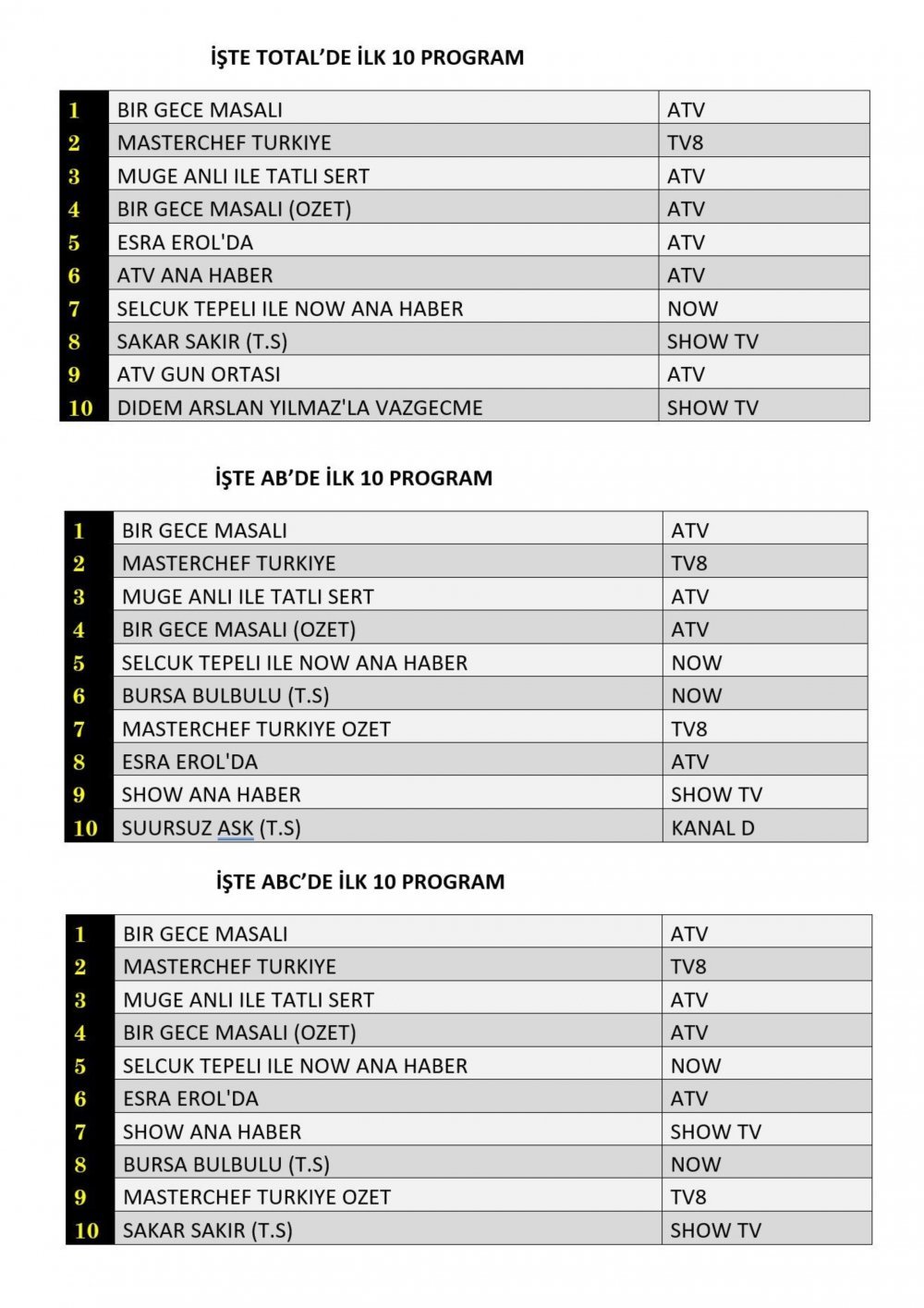 ABC'de ise 1.sırada “Bir Gece Masalı”, 2.sırada “Masterchef Türkiye”, 3.sırada “Müge Anlı Tatlı Sert” yer aldı.