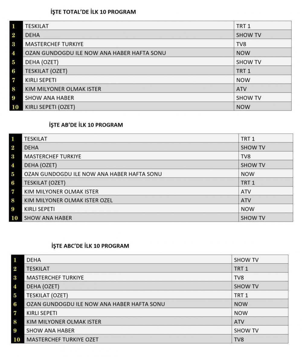 ABC'de ise 1.sırada “Deha”, 2.sırada “Teşkilat”, 3.sırada “Masterchef Türkiye” yer aldı.