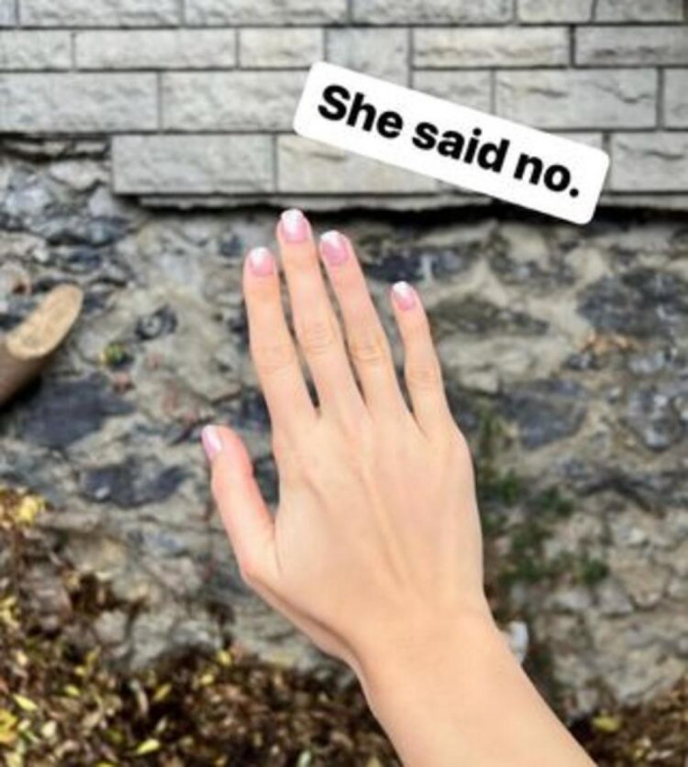 Yazıcıoğlu paylaşımında Saraçoğlu'nun elinin boş olması ve oyuncunun "She said no" ('hayır' dedi) yazması takipçilerini güldürdü.