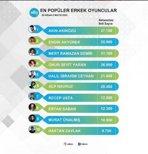Adba sosyal medyada 26 Nisan-2 Mayıs arasında sosyal medyada en çok konuşulan erkek oyuncuları belirledi.