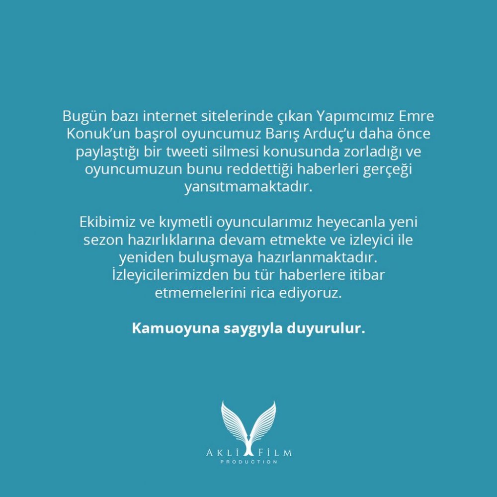 Emre Konuk'un dizinin başrol oyuncusu Barış Arduç'un yazmış olduğu bir tweeti sildirmek istediğine dair yapılan haberlere dair yapılan açıklamada, iddiaların gerçeği yansıtmadığı belirtildi.