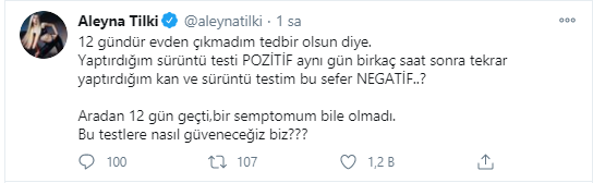 Twitter'dan yaptığı paylaşımda şu ifadeleri kullandı; "12 gündür evden çıkmadım tedbir olsun diye. Yaptırdığım sürüntü testi pozitif aynı gün birkaç saat sonra tekrar yaptırdığım kan ve sürüntü testim bu sefer negatif..? Aradan 12 gün geçti,bir semptomum bile olmadı. Bu testlere nasıl güveneceğiz biz???"