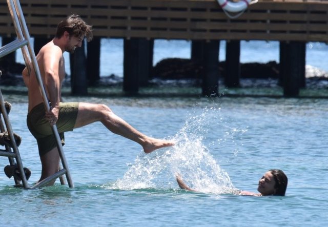 Navruz, ardından deniz girmek için otelin iskelesine doğru hareket etti. Sevgilisini yalnız bırakmayan Ayça Ayşin Turan da kendisini Bodrum'un serin sularına bıraktı.